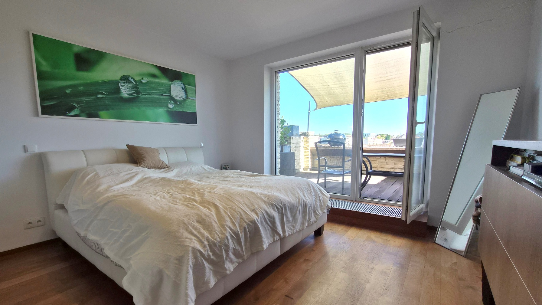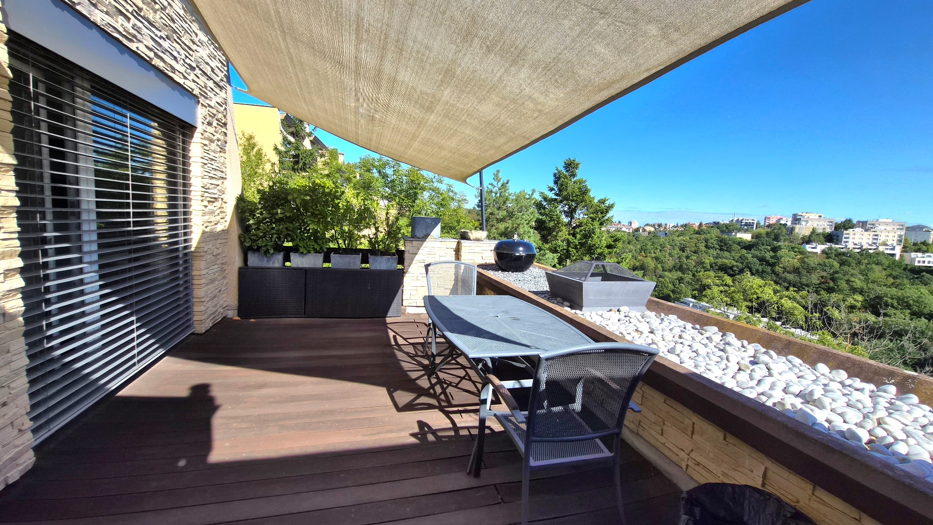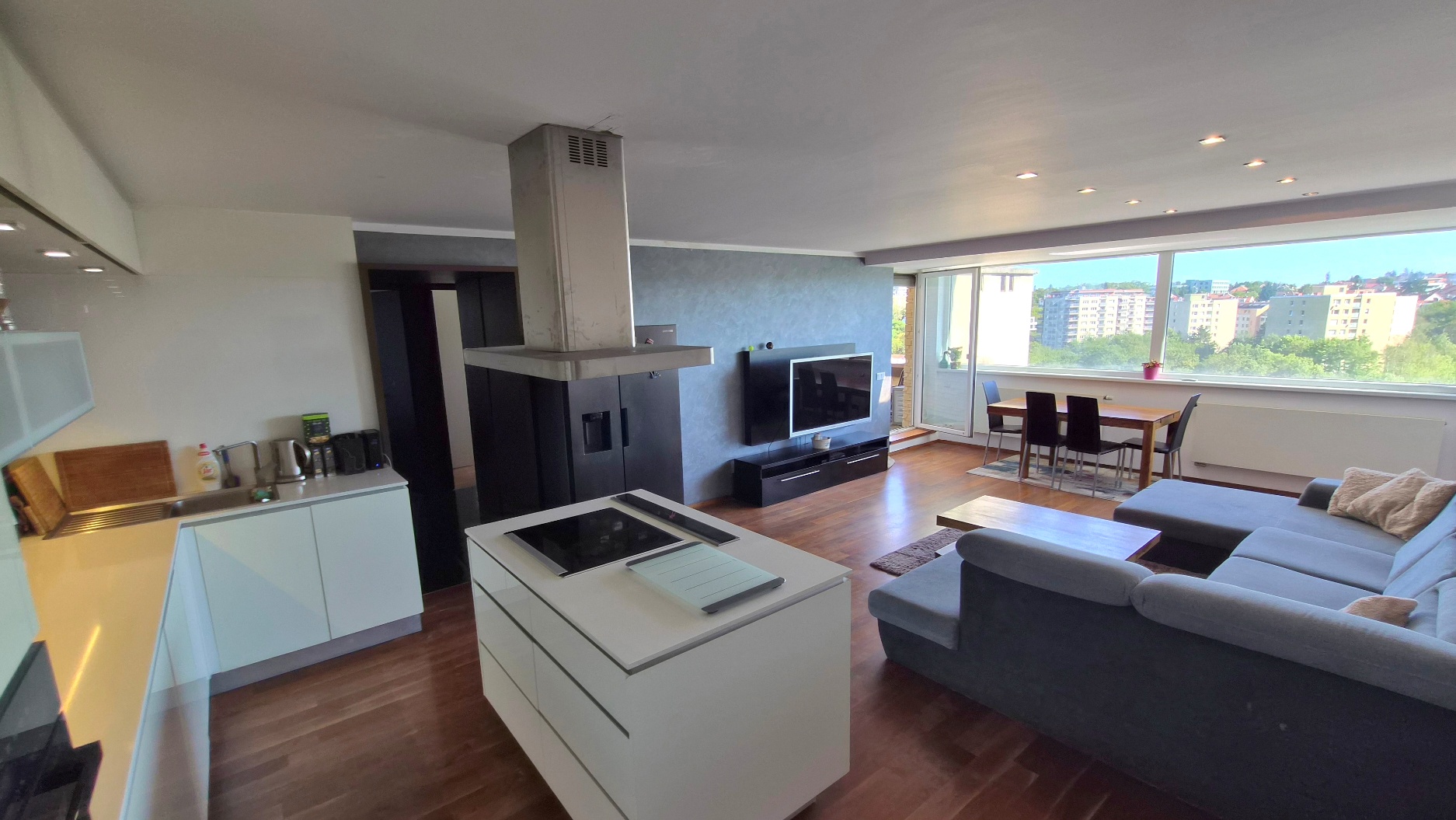 Slunný byt s nerušeným výhledem do zeleně v osobním vlastnictví o dispozici 3+KK/T s terasou, 132 m2 včetně příslušenství (terasa 27 m2, sklepní kóje 4 m2) a vlastním parkovacím místem, ul. Pod Šmukýřkou, Praha 5 – Košíře.