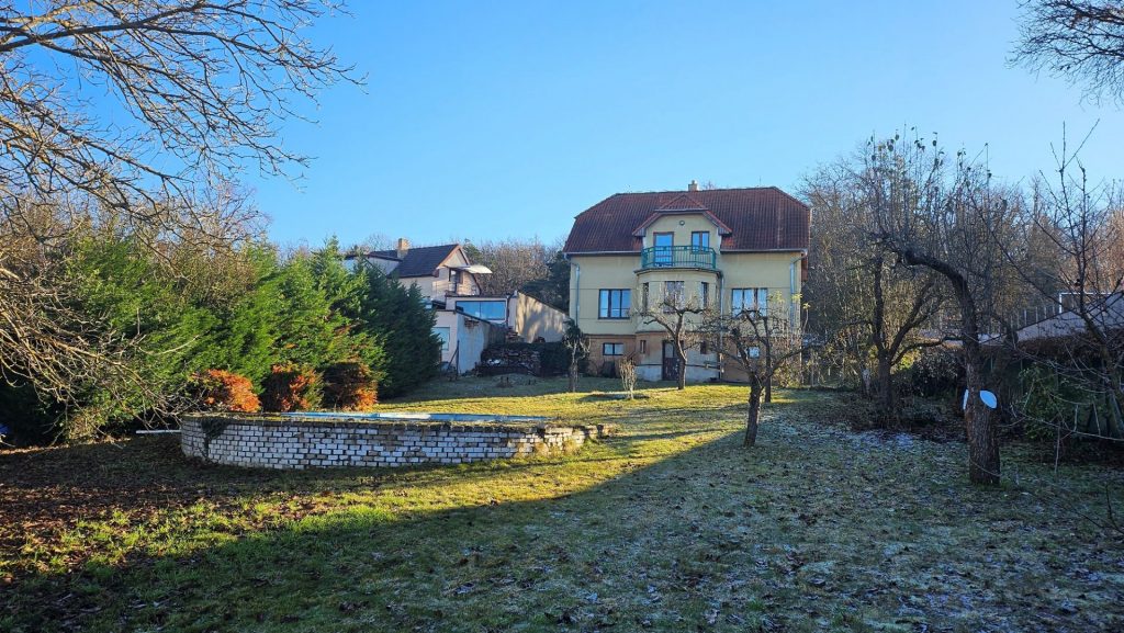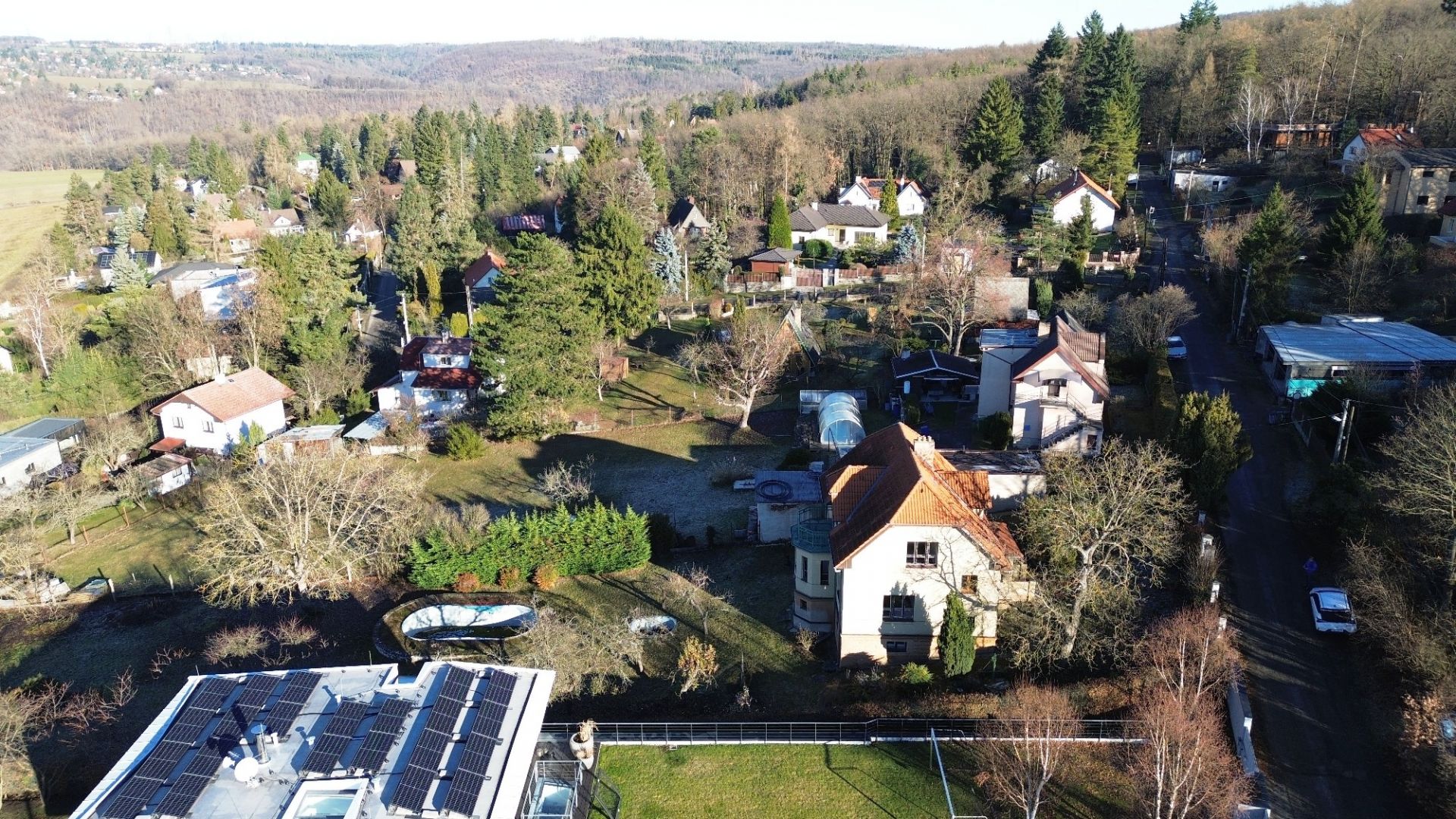 Vlastní pozemek 1.805 m2, zastavěná plocha domu 93 m2, oploceno, mírně svažitý pozemek se SZ orientací, udržovaná okrasná zahrada. Parkování vozidla bezproblémové v přilehlé ulici či na vlastním pozemku. Velice pěkný výhled do krajiny včetně údolí Vltavy.